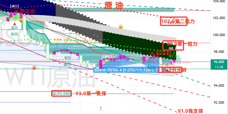空单:激进99.0±0.3区间,稳健102.0±0.3区间,止损‌:各0.8左右 ,目标位‌:93.0附近!